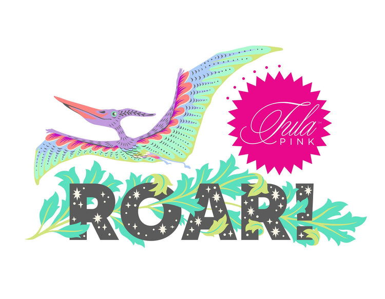 Roar! by Tula Pink is a whimsical take on fancy dinosaurs for those of us who keep one foot firmly planted in fantasy. This pre-historic landscape is drenched in details and color. Here you will find a sophisticated T-Rex in a topiary, A Triceratops out for a stroll on a windy parkway path, happy little hidden Raptors in a dainty damask, and Pterodactyls taking time to smell the flowers. It's just your average lazy afternoon in the garden with the giants of Earth's history.
