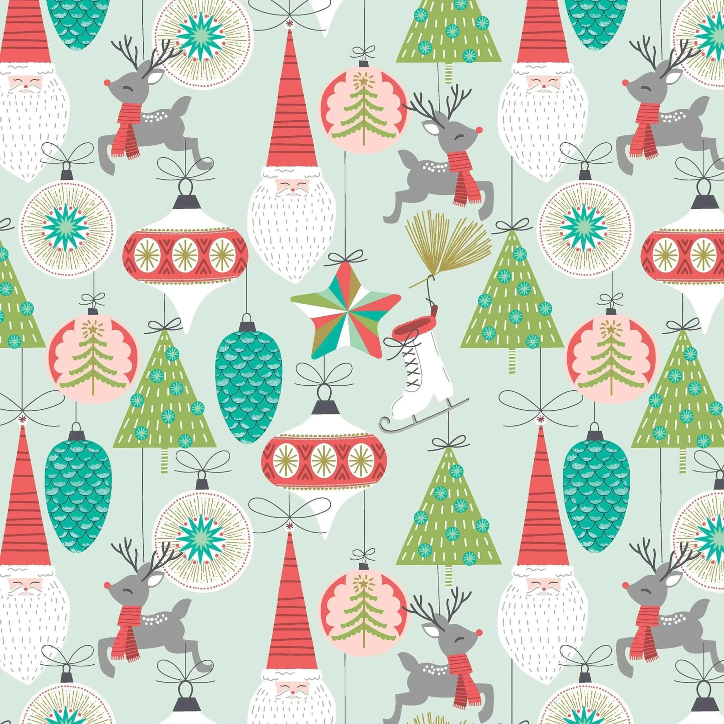 Fa La La Bells & Baubles in Aqua features prancing reindeer, ice skates, and jolly ole St. Nick surrounded by colorful holiday ornaments on a soft aqua blue background.