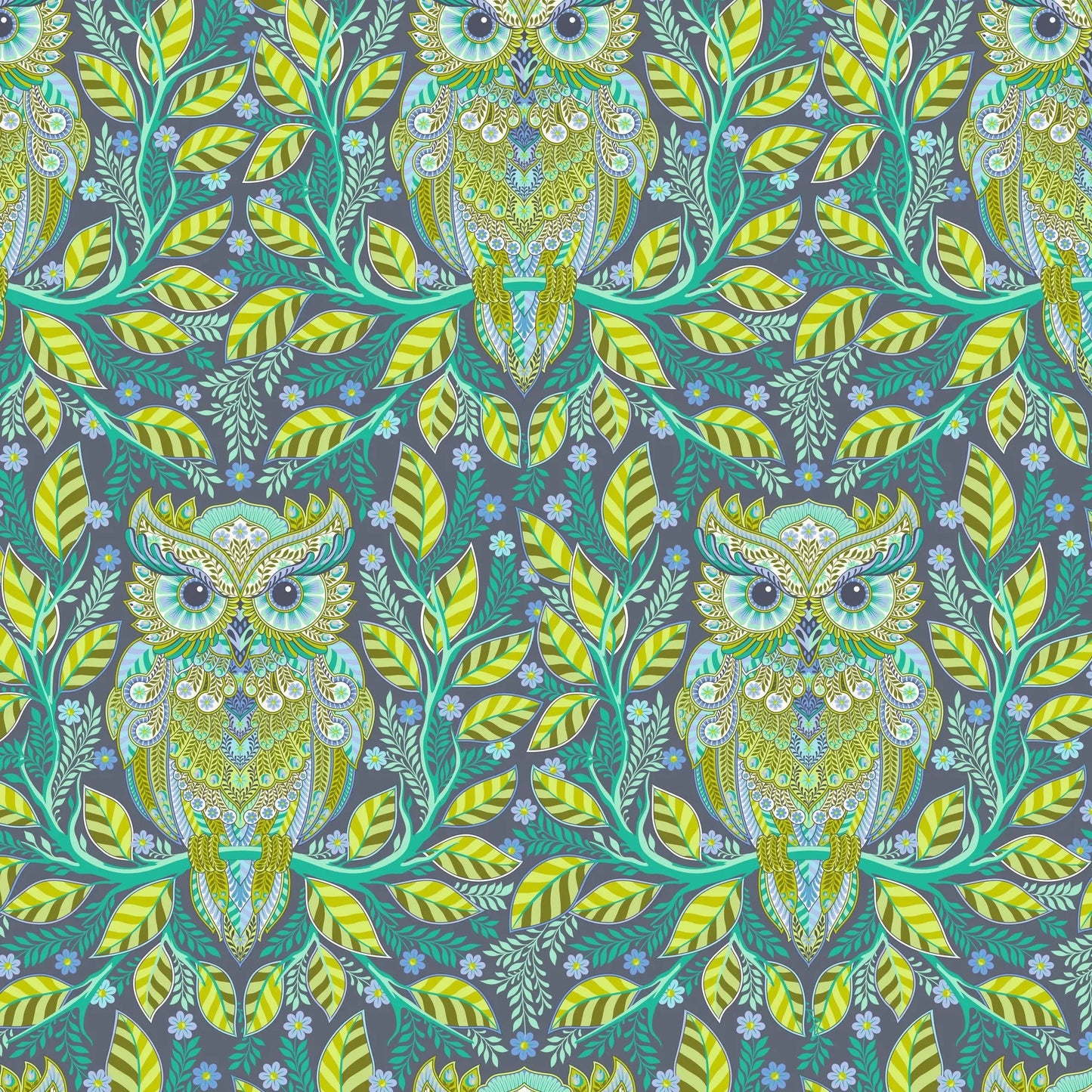 Full Moon Forest II Hootie Patootie in Starlight features large purple and green owls adorned with intricate floral designs. Teal branches and green-striped leaves frame these whimsical motifs against a dark blue background.