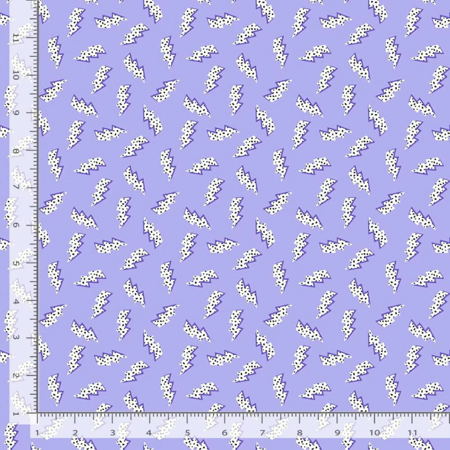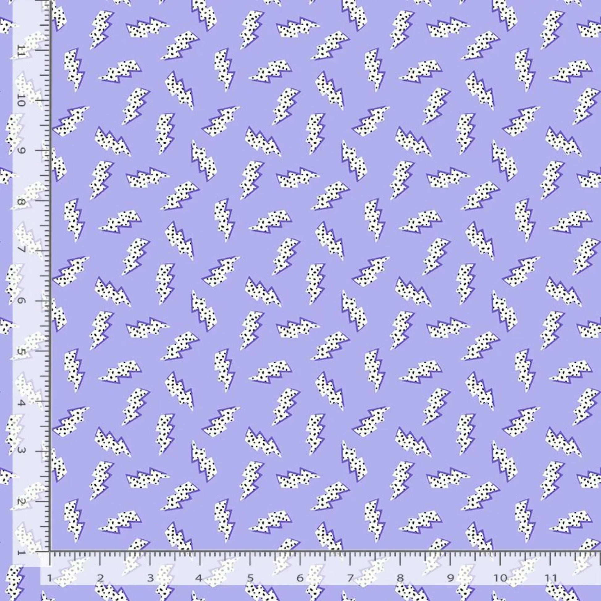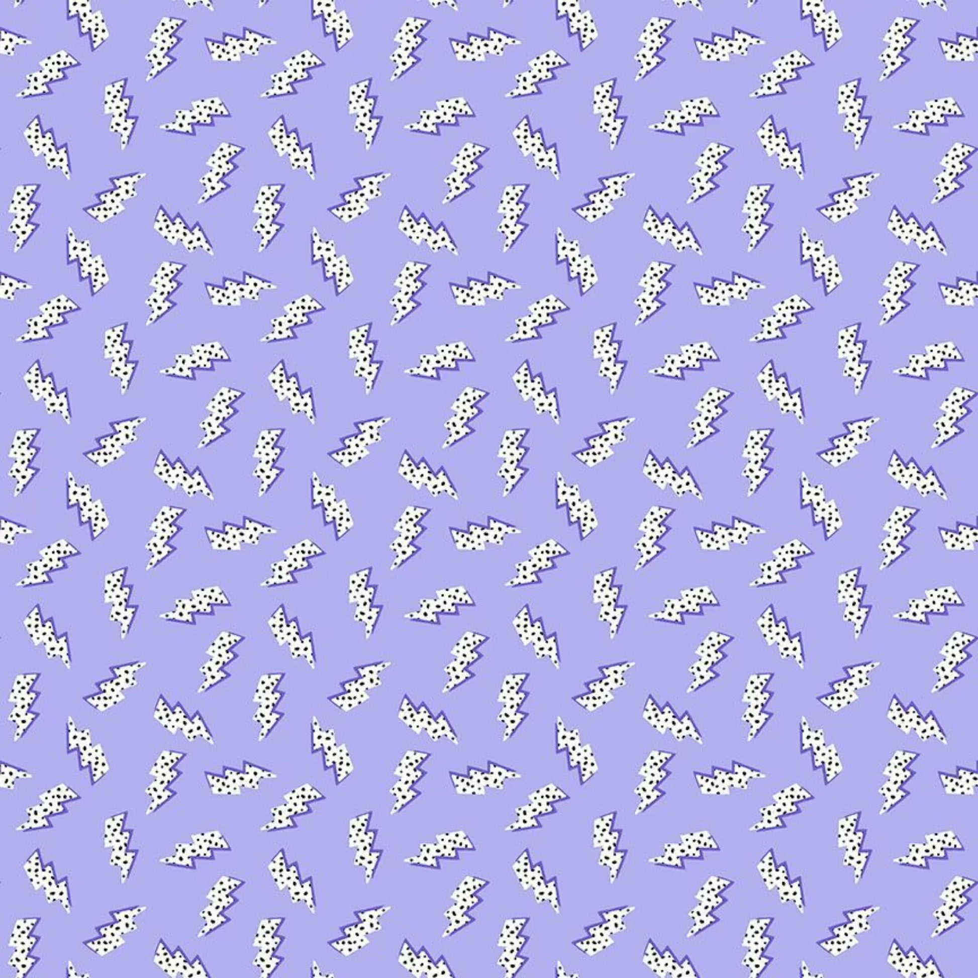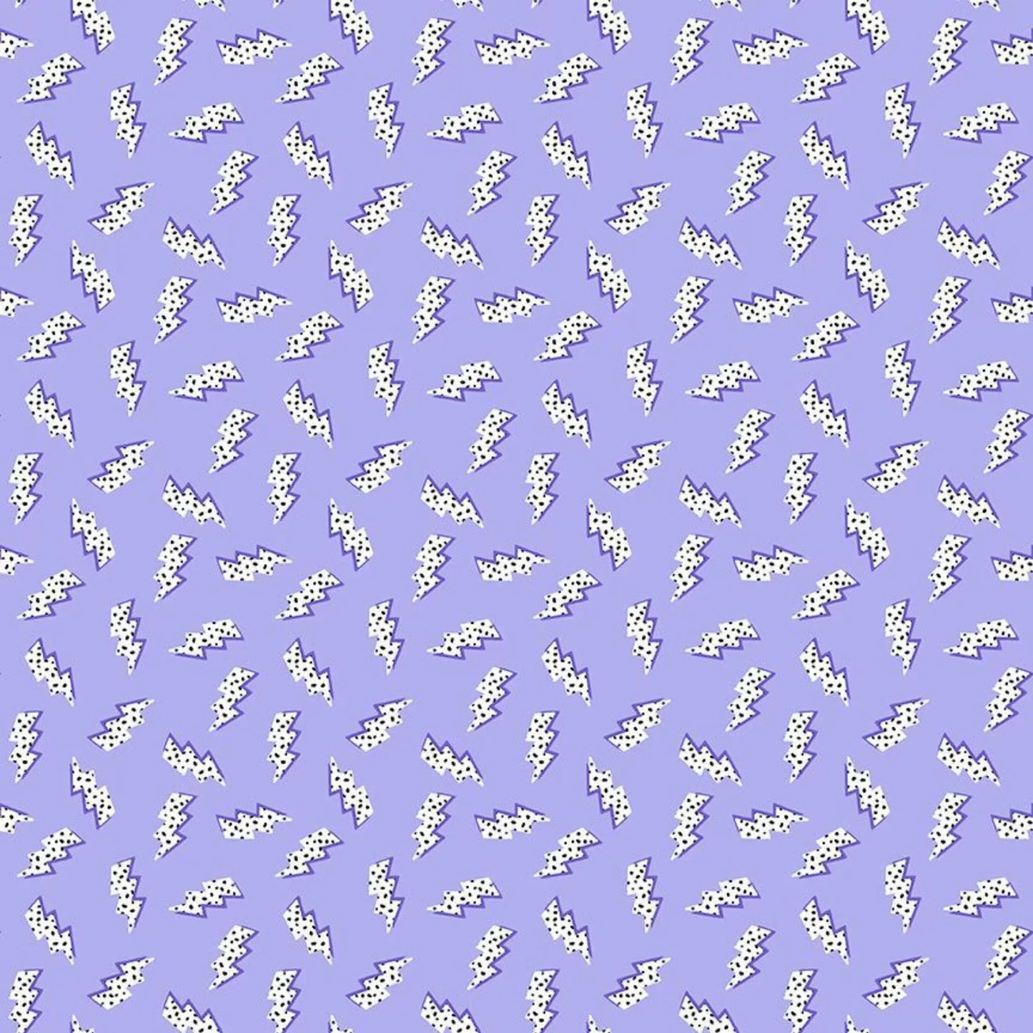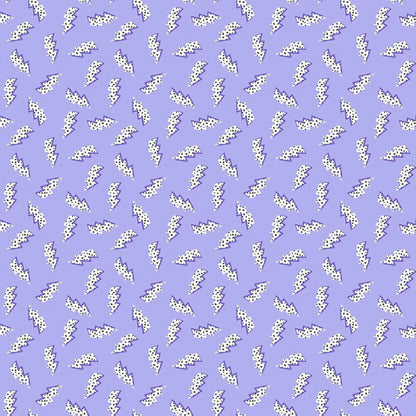 Mix Tape Bolt in Lilac features white lightning bolts with black polka dots tossed across a soft lilac background. Each bolt has a slight drop shadow in dark purple, creating a cartoonish 2D effect. The playful style of this pop art-inspired print is perfect for projects that need an extra touch of awesome.