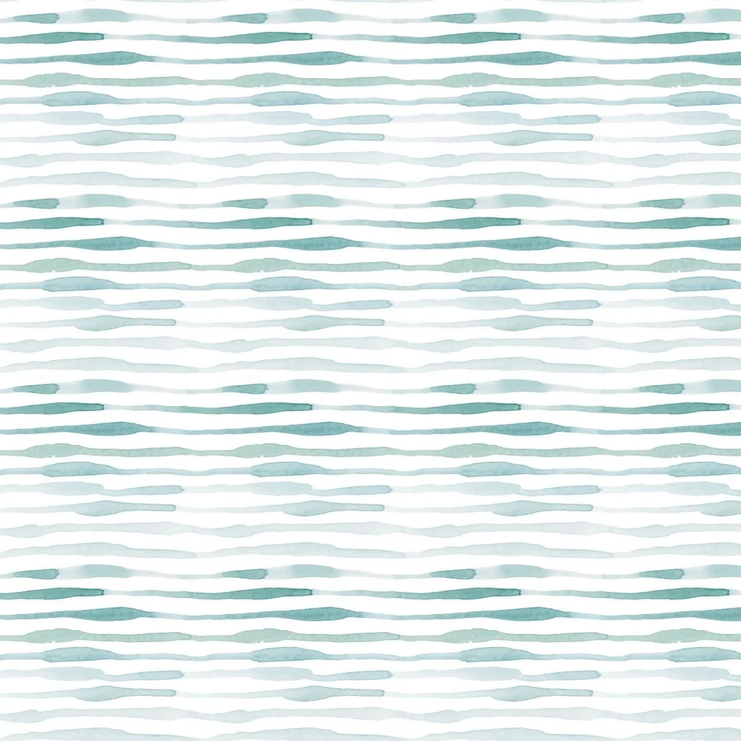 Natural Affinity Drift in Celadon features undulating watercolor stripes in blue, teal, and green pastels floating across a soft white background. Stripes run perpendicular to the selvage.