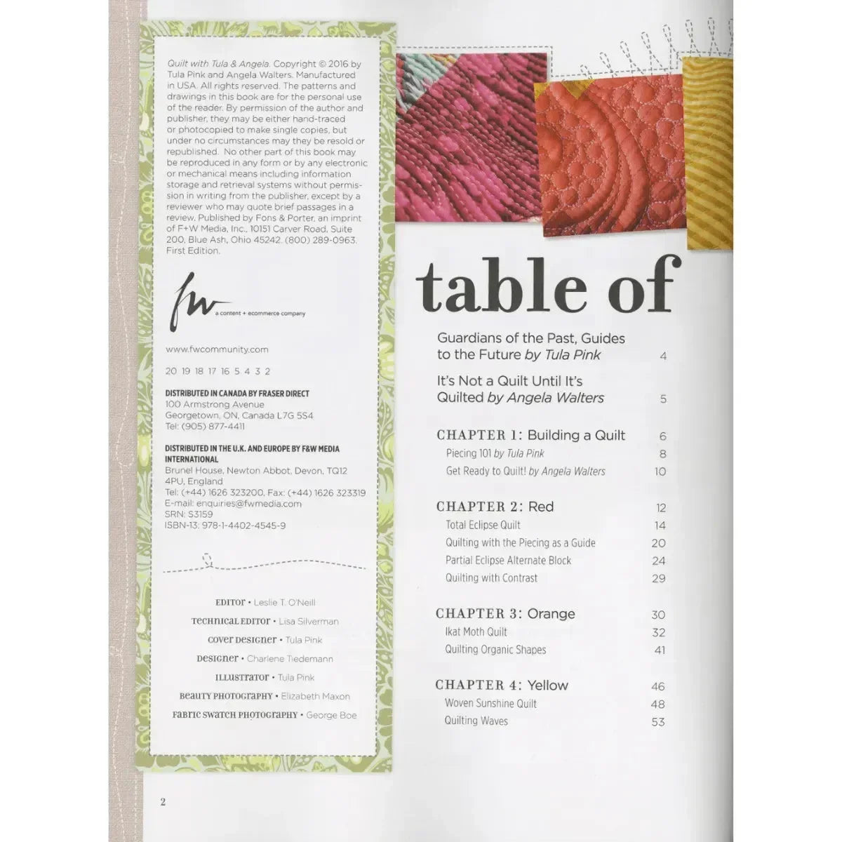 Two of the biggest celebrities in quilting take the guesswork out of color, shape, and line, giving their brilliant aesthetic punch to 17 quilt patterns. Quilt with Tula & Angela is a start-to-finish guide that also includes essentials on tools, quilting, backing, and binding plus 24 quilting motifs.