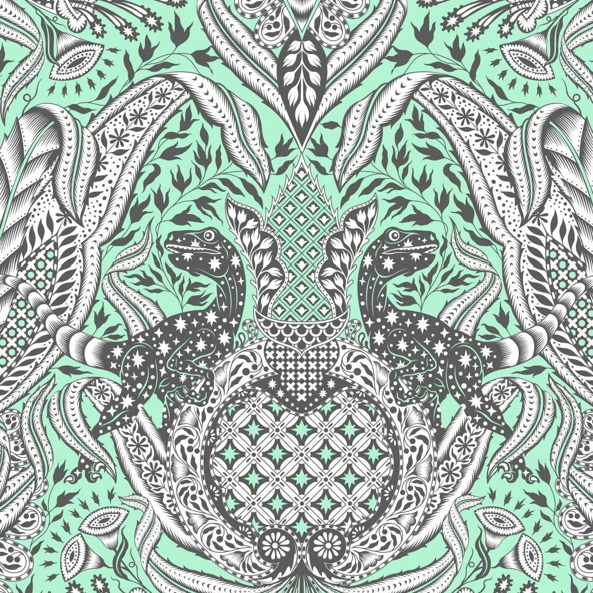 Roar! is a whimsical take on fancy dinosaurs for those of us who keep one foot firmly planted in fantasy. This prehistoric landscape is drenched in details and color. Here you will find a sophisticated T-Rex in a topiary, A Triceratops out for a stroll on a windy parkway path, happy little hidden Raptors in a dainty damask, and Pterodactyls taking time to smell the flowers. It's just your average lazy afternoon in the garden with the giants of Earth's history.